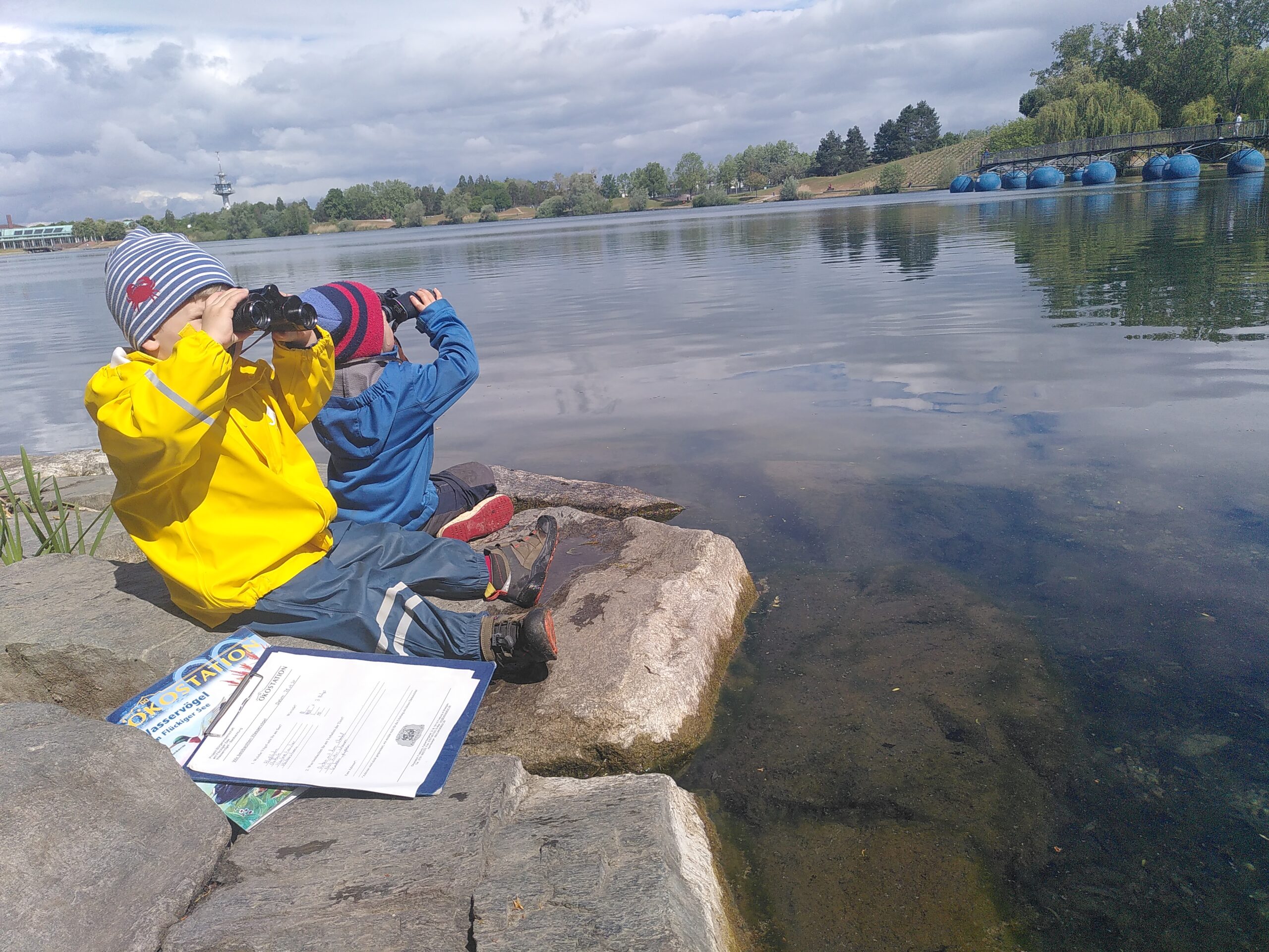 Mit Hilfe von Tablets suchen die Schüler*innen in Teams sieben Caches rund um den Flückigersee an der Ökostation. Klasse 1-6